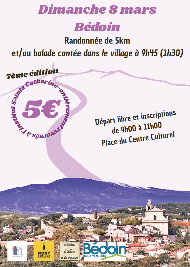 Dimanche 8 mars 2026 à Bédoin se tiendra la 7e édition de la randonnée et/ou visite guidée du village. Les 5€ d’inscription seront entièrement reversés à l’institut Sainte-Catherine.