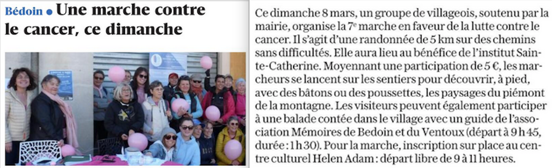 Le dimanche 8 mars 2026, une randonnée et une visite guidée du village de Bédoin par l’association Mémoires de Bédoin et du Ventoux au profit de la lutte contre le cancer sont organisées par Nathalie Eymere avec le soutien de la mairie.